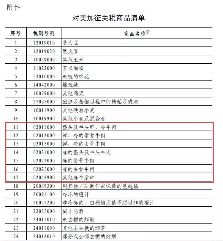 當天,根據(jù)《中華人民共和國對外貿(mào)易法》和中華人民共和國進出口條例相關(guān)規(guī)定,及經(jīng)國務院批準,國務院關(guān)稅稅則委員會決定,對原產(chǎn)于美國的大豆、汽車和牛肉等14類106項商品加征25%關(guān)稅。