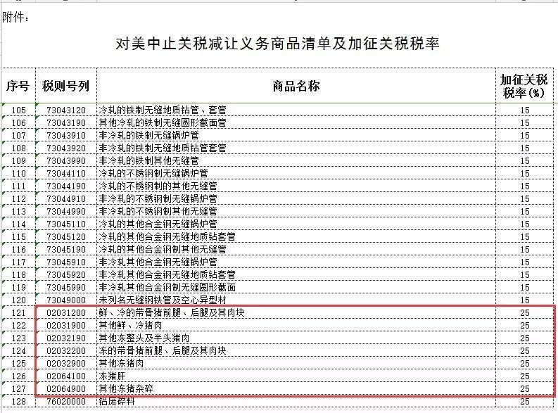 作為回應,經(jīng)中國國務院批準,國務院關(guān)稅稅則委員會決定自2018年4月2日起,對原產(chǎn)于美國的7類128項進口商品中止關(guān)稅減讓義務,在現(xiàn)行的適用關(guān)稅稅率基礎(chǔ)上加征關(guān)稅,其中美國豬肉各類產(chǎn)品赫然在列。
