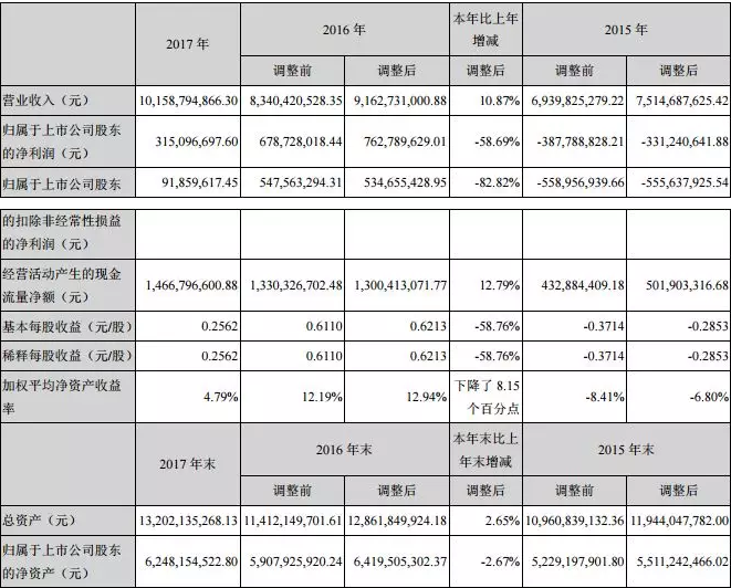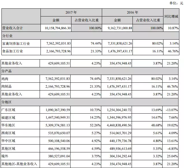 4月23日,圣農發展發布2017年年報,2017年公司營業收入101.59億元,同比增長10.87%;歸屬于上市公司股東的凈利潤3.15億元,同比下降58.69%。