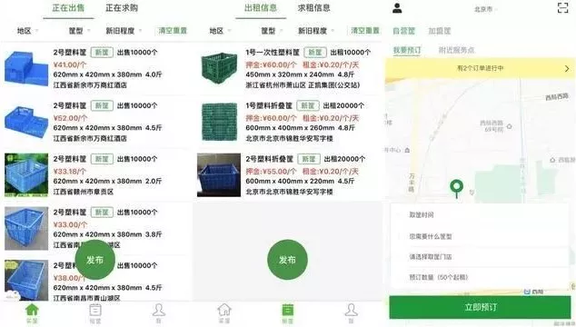 它的買賣和租賃服務,主要面向塑料廠商和果蔬批發商。共享業務則由平臺投放折疊周轉筐,單個成本50元,有異地取還和同地取還等多種租賃方式,平均租金為每個筐每天2角,押金50元。