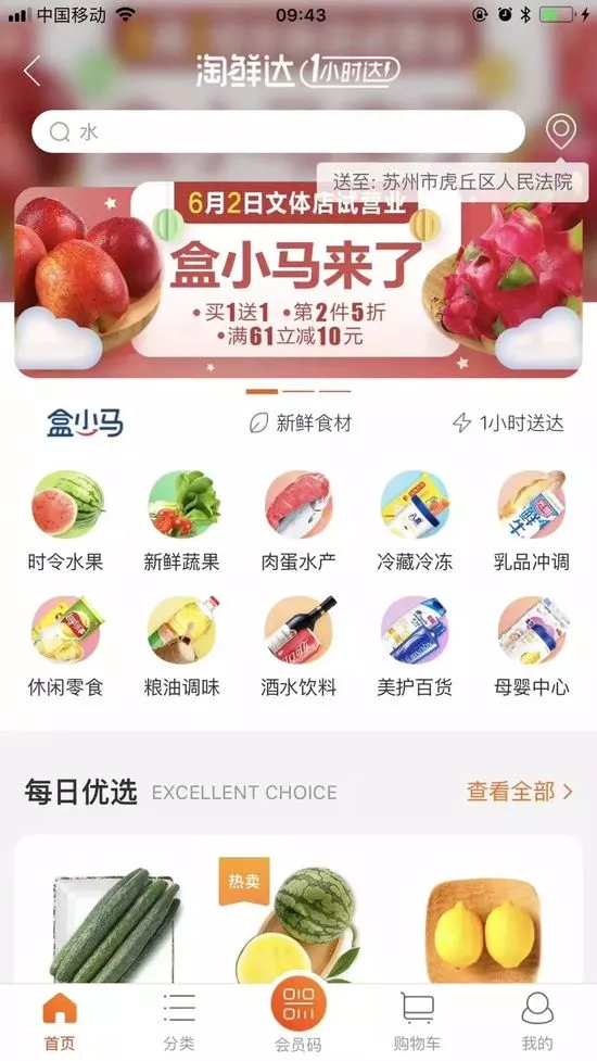 1、突出生鮮。從手淘頁面可見,“盒小馬”首店希望突出“新鮮食材”和“1小時送達”兩個訴求點。品類包括時令水果、新鮮蔬果、肉蛋水產、冷藏冷凍、乳品沖調、休閑零食、糧油調味、酒水飲料、美護百貨、母嬰中心等八大品類。門店生鮮占比超過50%。