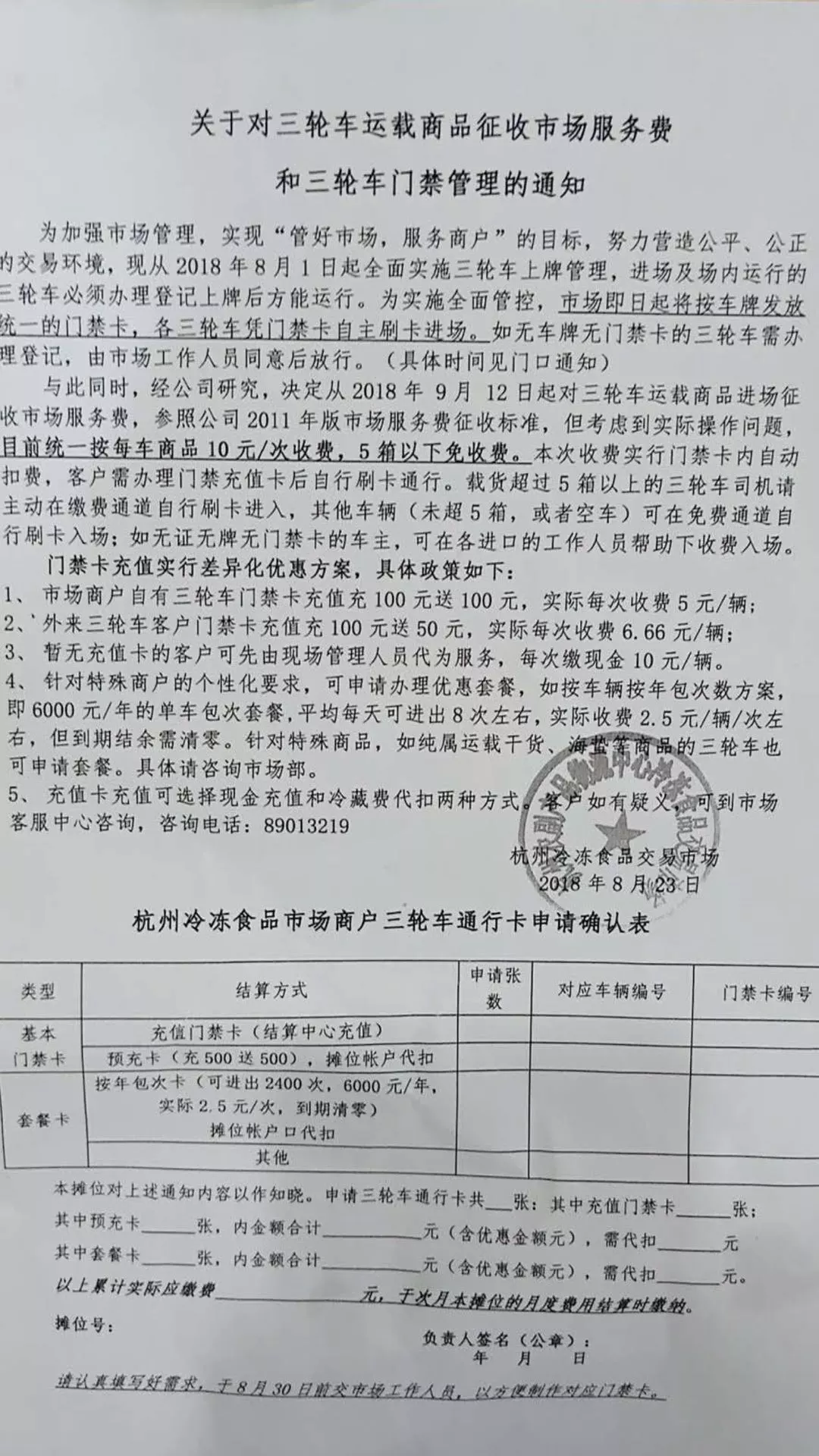 8月23日,杭州冷凍食品交易市場再發一則“關于對三輪車運載商品征收市場服務費和三輪車門禁管理”的書面通知,稱經公司研究,決定從9月12日起,對載貨超5箱(5箱以下免費)的三輪車進場征收10元/次的市場服務費,同時公布了充100元送100元、充100元送50元、或者6000元/年的單車包次套餐等一系列充值優惠政策。