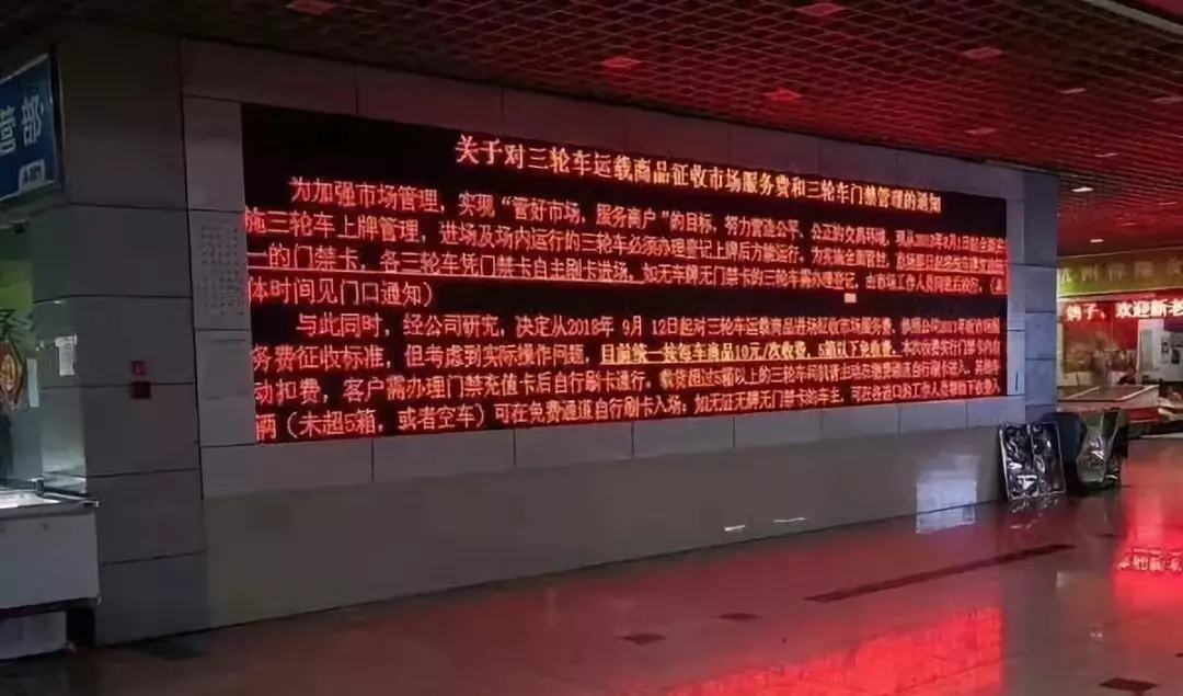 不少商戶表示是8月25日在門店收到這份書面通知,在市場內平時發布公告信息的大屏幕上,也醒目地公布了這則收費通知,滾動播出。見下圖: