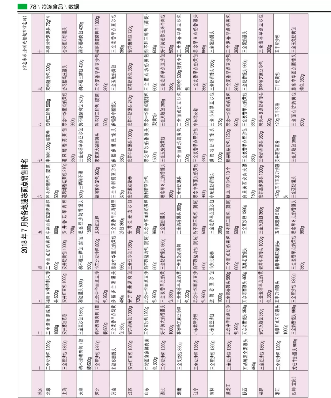 ▼2018年7月份各地速凍面點銷售排名