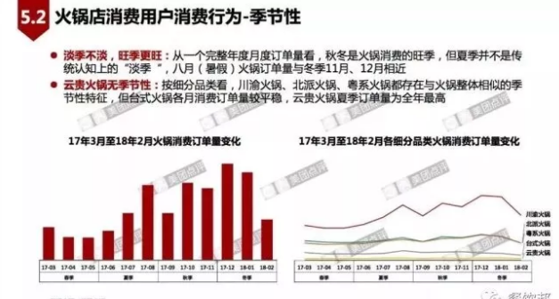 雖然火鍋的旺季是秋冬,但從數據來看,夏季并不是傳統認知的“淡季”。尤其8月(暑假)火鍋訂單量與冬季11月、12月相近。按照細分品類來看,臺式火鍋各月消費訂單量較平穩,云貴火鍋夏季訂單量為全年最高。