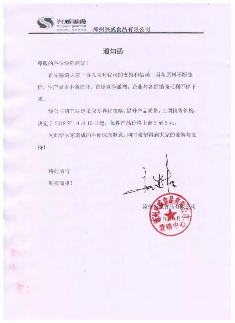 就在國慶假期的最后一天,10月7日,漳州興威食品有限公司(簡稱“興威食品”)也發(fā)出了類似的通知函:決定于10月10日起,每件產品價格上調3至5元。