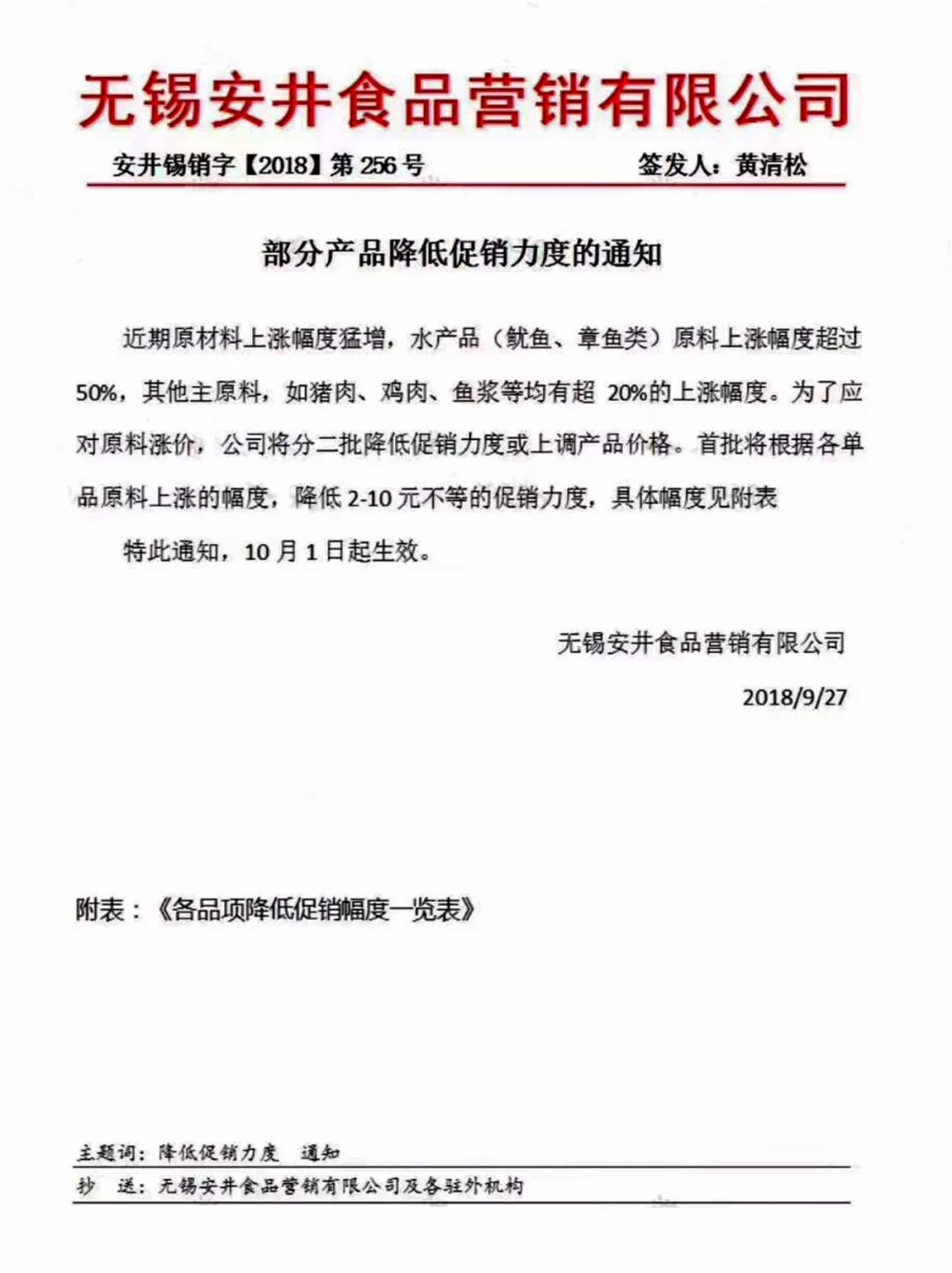 9月27日,無錫安井食品營銷有限公司(簡稱“安井食品”)發(fā)出的“部分產品降低促銷力度的通知”,在朋友圈廣為傳播。