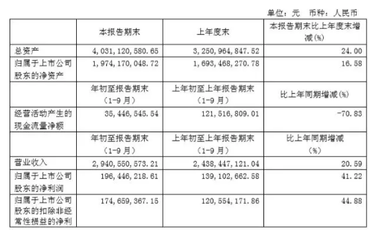公告顯示,安井食品前三季度實現營業收入29.4億元,同比增長20.59%;實現凈利潤1.96億元,同比增長41.22%。