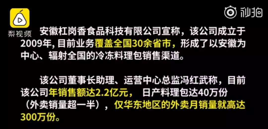 視頻中,安徽杠崗香食品科技有限公司董事長助理、運(yùn)營中心總監(jiān)馮紅武稱,目前杠崗香料理包行業(yè)在全國排在第一梯隊,日產(chǎn)料理包達(dá)四十萬份,外賣超過50%,每個省都有代理商,一個月華東地區(qū)銷售額大概一千多萬。