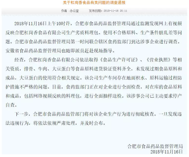 晚上8點11分,合肥市食品藥品監(jiān)督管理局在官網(wǎng)就此事件發(fā)表調(diào)查通報,全文如下: