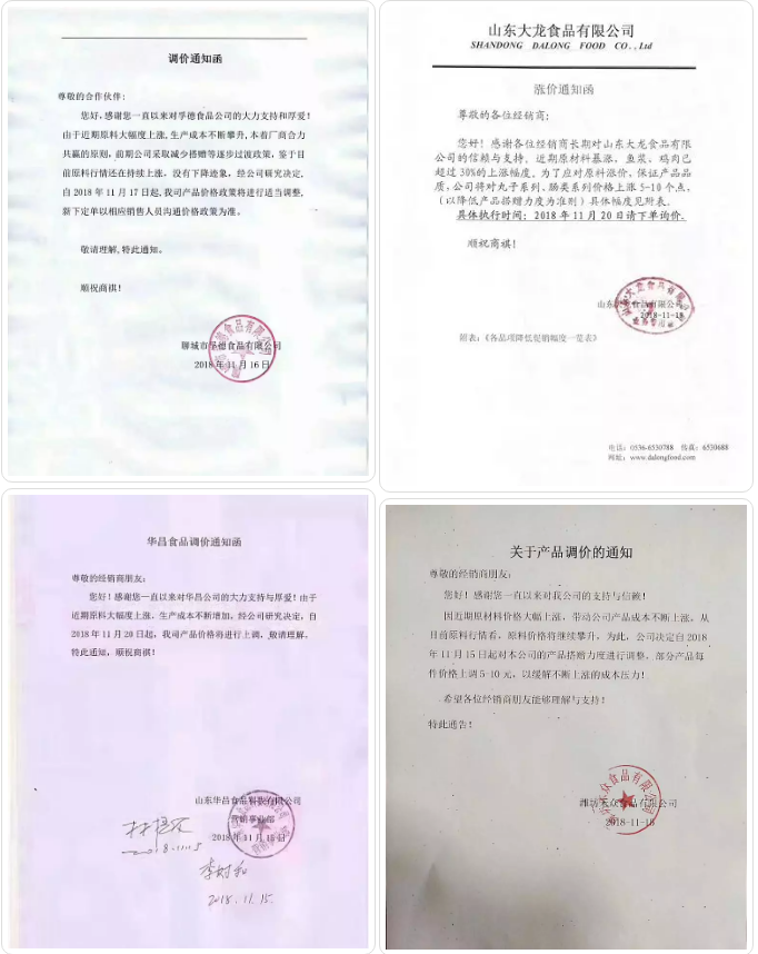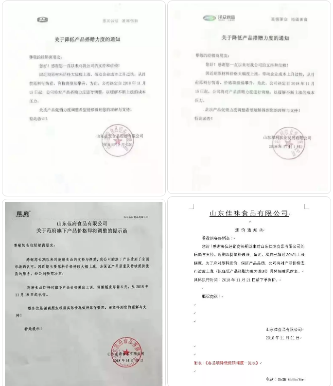 據(jù)小編的初步統(tǒng)計,孚德食品公司、山東惠發(fā)食品股份有限公司、山東大龍食品有限公司、山東范府食品有限公司、華昌食品、濰坊禾眾食品有限公司等相繼推出調(diào)價通知函,具體內(nèi)容如下: