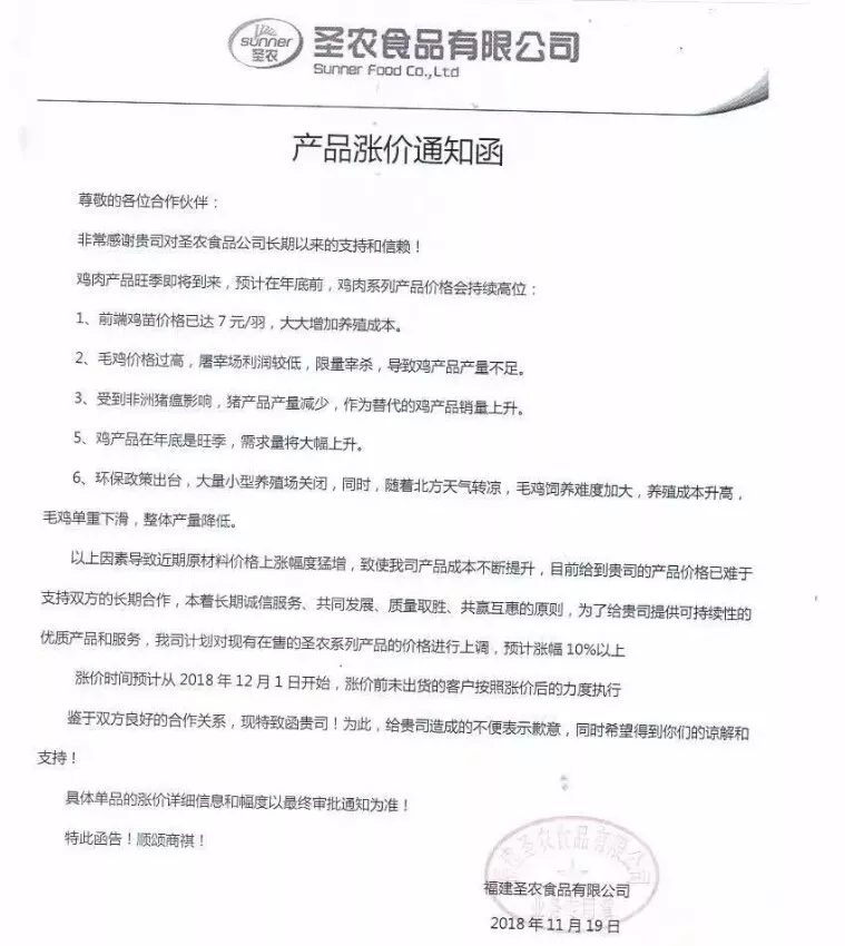 白羽雞上市公司圣農(nóng)食品發(fā)布了漲價通知,稱因受到非洲豬瘟影響,豬產(chǎn)品產(chǎn)量減少,作為替代品的雞產(chǎn)品銷量上升;與此同時,大量小型養(yǎng)殖場因環(huán)保原因關(guān)閉、加上北方天氣轉(zhuǎn)涼、養(yǎng)殖成本升高,造成了整體毛雞產(chǎn)量變低。“計劃對現(xiàn)有在售的圣農(nóng)系列產(chǎn)品價格上調(diào)10%以上。”