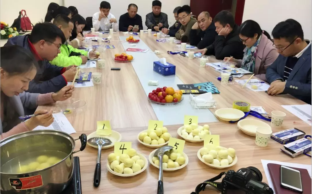 盲測部分:去掉產品包裝后,放在同一容器中,現場評委從以下六個方面進行打分,產品外觀美觀度、產品色澤、外皮軟糯程度及大黃米香味、餡料口感、綜合口感、性價比。