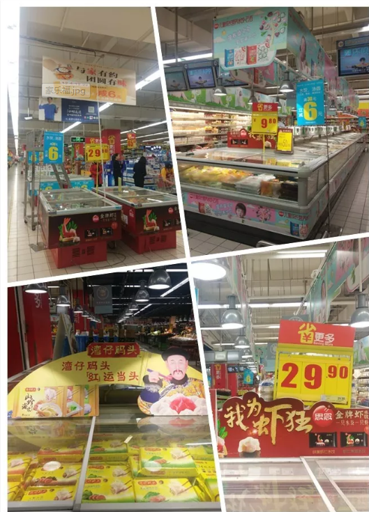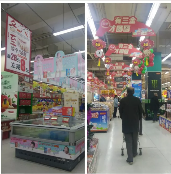 現(xiàn)場:“有三全 才團圓”的廣告板烘托出了濃濃的過節(jié)氛圍,而超市開展的湯圓水餃類產品滿28元立減8元的活動則給了消費者實實在在的優(yōu)惠。