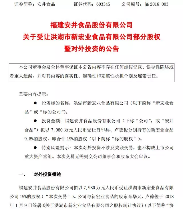 1月9日晚,安井食品發(fā)布公告,擬以7980萬(wàn)元受讓新宏業(yè)食品19%的股權(quán)。公司與新宏業(yè)食品的股東肖華兵、盧德俊于2018年1月9日簽署《關(guān)于洪湖市新宏業(yè)食品有限公司之股權(quán)轉(zhuǎn)讓協(xié)議》。