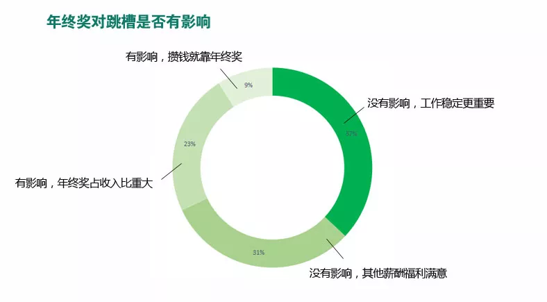 但是即便大部分人對今年的年終獎的增長沒有信心,卻很難讓他們因為年終獎而跳槽。半數以上的受訪者年終獎占全年收入的比例僅為20%左右,即便不滿意年終獎,但工作的穩定性、工作環境、企業福利是他們更看重的要素。只有少數受訪者表示收入依賴年終獎,如果年終獎不滿意一定會尋找機會跳槽。因此企業在人才管理上,需要特別注意年終獎對于員工保留的影響,提前做好預防工作。