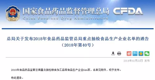 2018年食品藥品監管總局重點抽檢