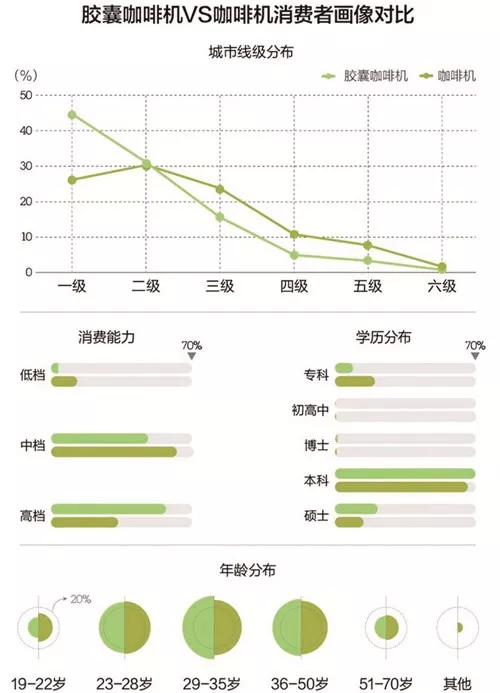 筆者對比了膠囊咖啡機與普通咖啡機的消費者畫像發(fā)現(xiàn),購買前者的人群明顯更精英、中產化。