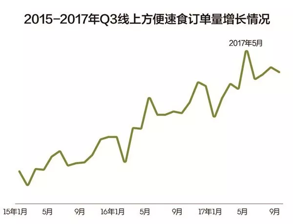 貝恩在《2017年中國購物者報告》中提到,2013—2016年,用于家庭烹飪的食物消費量每年增長約3%,而相同時間內,外賣市場的年增速約為44%。從阿里數(shù)據(jù)(淘寶和天貓)來看,方便食品的線上銷量也在不斷增長。