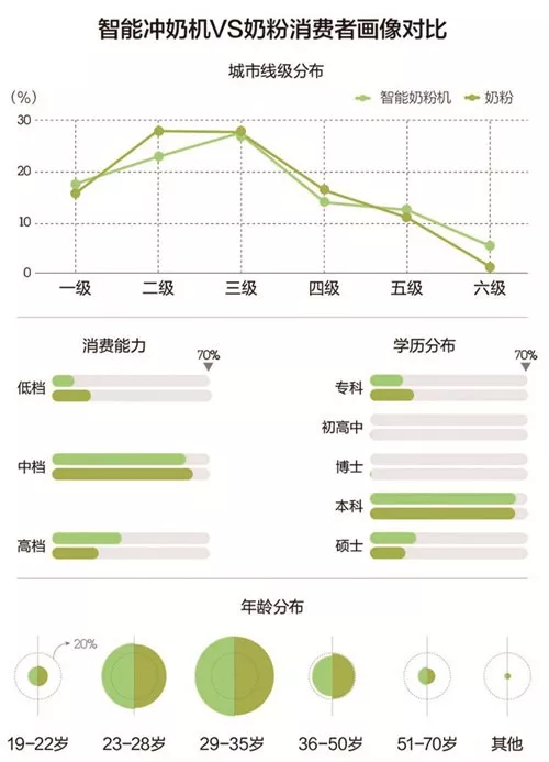 對比線上智能沖奶機和奶粉的消費者畫像來看,前者的訂單中,來自一線城市、高學歷、中產、23~35歲的消費者占比明顯較高。