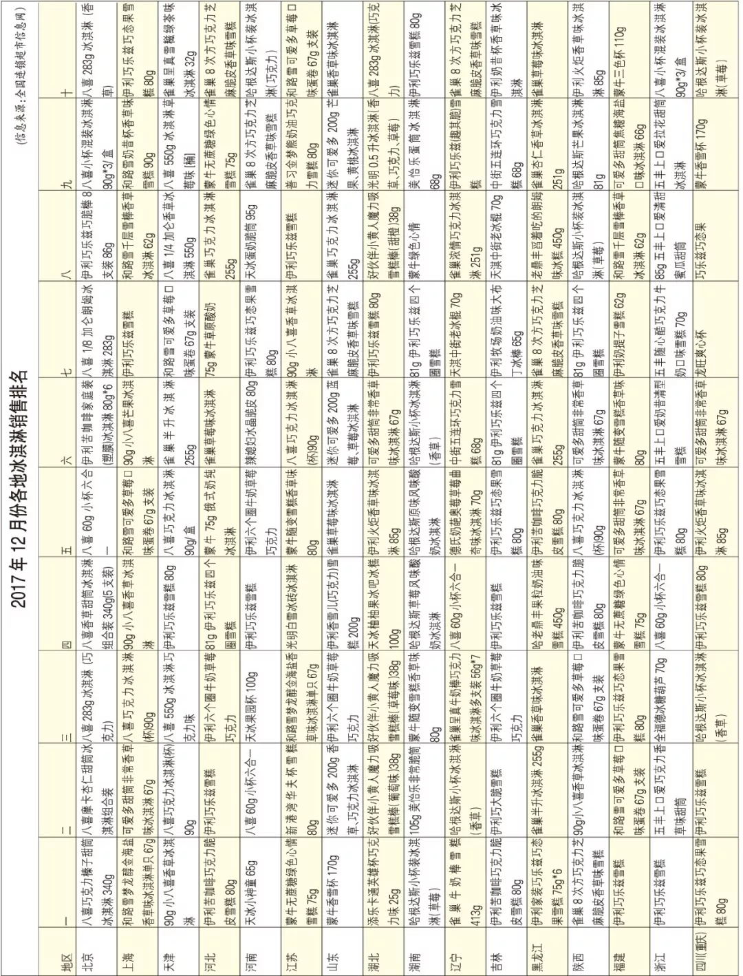 ▼2017年12月份各地冰淇淋銷售排名