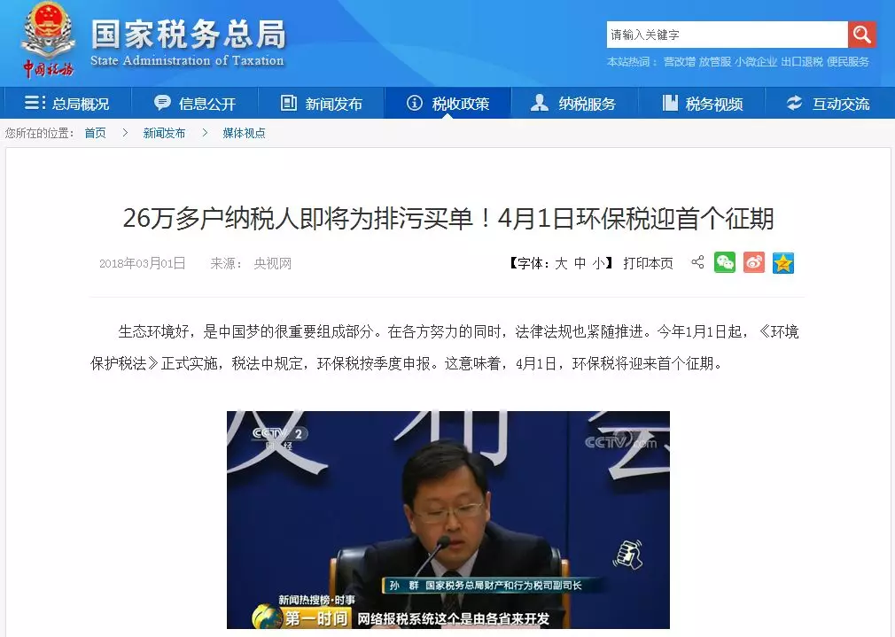 2018年1月1日,環境保護稅法已正式實施。按照稅法規定,環保稅按季度申報,這意味著,4月1日,環保稅將迎來首個征期。截至目前,各地稅務機關已識別認定環保稅納稅人26萬余戶。