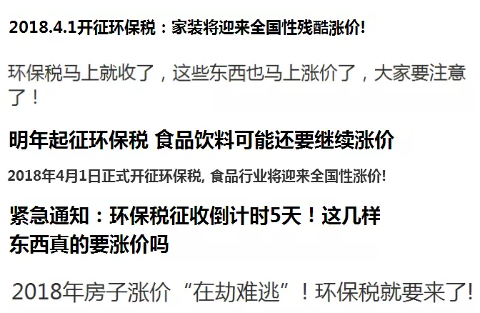 這種近乎“煽動性”的文章比比皆是。隨手在網絡上搜索關鍵字“環保稅”、“漲價”等,各行各業都難于幸免。滿眼“漲價潮”弄得人心慌慌。