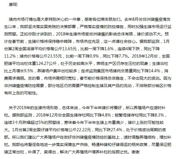 唐珂稱,總的來說,市場供需相對寬松,春節前價格保持總體穩定,不會出現大的波動。因為非洲豬瘟疫情防控需要,部分地區仍然需要嚴格控制生豬及其產品的流動,不排除部分銷區價格有所上漲的可能性。