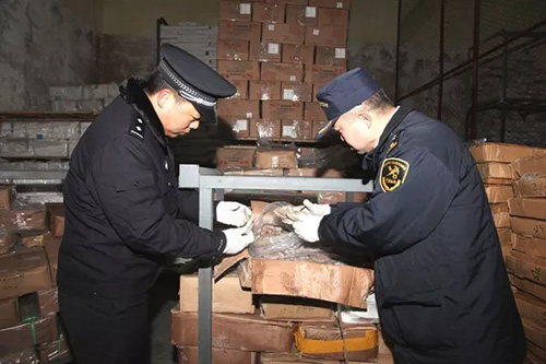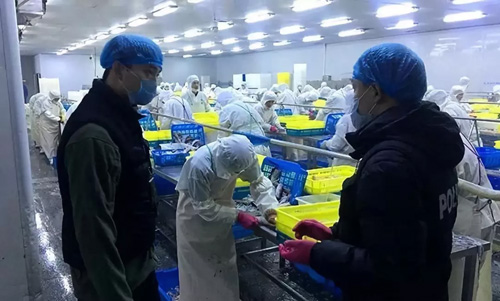 △緝私警察在凍品加工廠調(diào)查取證