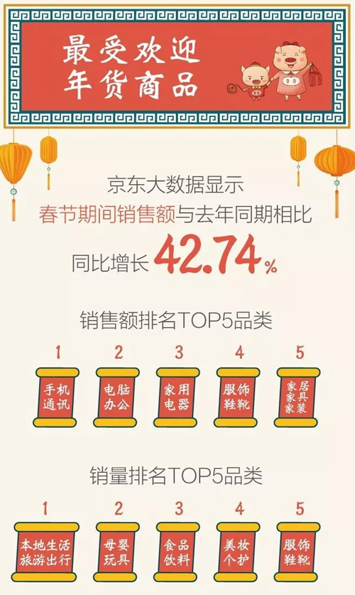 據(jù)京東大數(shù)據(jù)顯示,春節(jié)期間銷售額與去年同期相比,同比增長(zhǎng)42.74%。