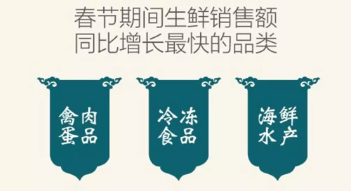 值得注意的是,與去年同期相比,春節(jié)期間生鮮銷售額同比增長(zhǎng)最快的品類是:禽肉蛋品、冷凍食品、海鮮水產(chǎn)。