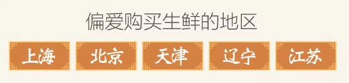 從地域上來看,購(gòu)買生鮮較多地區(qū)的城市為,上海、北京、天津、遼寧、江蘇。南方偏愛湯圓,北方更喜歡速凍水餃。而水產(chǎn)海鮮類則是所有城市消費(fèi)者的最愛。