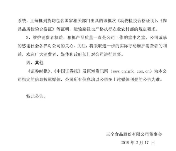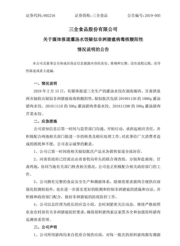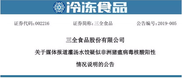公告顯示,2019年2月15日,有媒體報道三全生產(chǎn)的灌湯水餃在湖南湘西、甘肅酒泉兩市抽檢出疑似非洲豬瘟病毒核酸陽性,疑似批次包括20190113H的1000g灌湯豬肉水餃、20181111H的500g灌湯豬肉香菇水餃、20181129H的500g灌湯豬肉芹菜水餃。