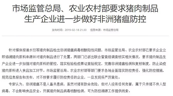 昨天晚上,國家市場監(jiān)督管理總局、農(nóng)業(yè)農(nóng)村部發(fā)話了,要求豬肉制品生產(chǎn)企業(yè)進(jìn)一步加強(qiáng)對豬肉原料的管控,完善非洲豬瘟檢測和復(fù)核制度,防止染疫豬肉原料進(jìn)入食品加工環(huán)節(jié)。