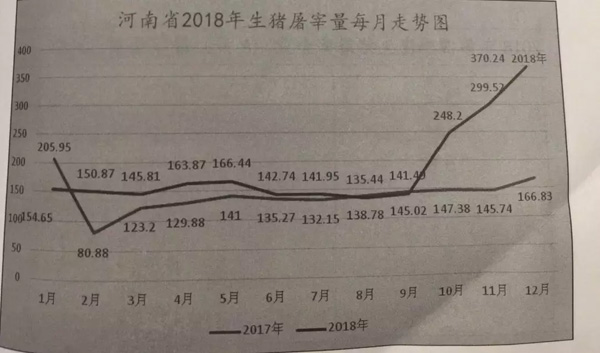 但隨著10月份生豬產品可以外調,禁令解除,河南省各大屠宰場加大馬力生產,2018年10~12月共完成屠宰917.96萬頭,為本年度季度最高,12月份屠宰量最大,達到370.24萬頭,這一數據比2017年同期167.03萬頭增加203.41萬頭,增幅為121.66%。