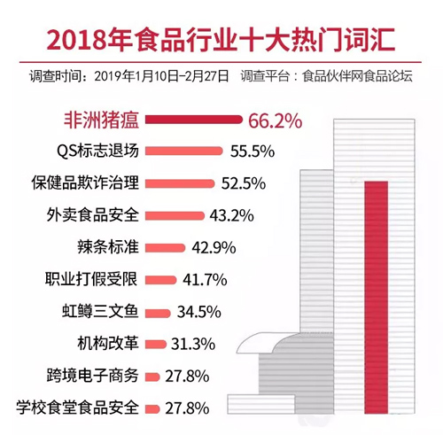 按照以往的慣例,本次活動首先由食品論壇的熱心網友針對2018年熱門事件概括成一個關鍵詞提交,后經過整理篩選出20個候選詞匯,并于2019年1月10日-2月27日在食品論壇投票。期間共有708位經過審核認證的注冊網友參與投票,最終選出“非洲豬瘟”、“QS標志退場”、“保健品欺詐治理”等十大熱門詞匯。