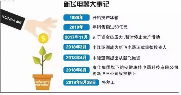 2017年11月,新飛公司宣布破產重整;2018年4月13日,豐隆亞洲決定撤出新飛。