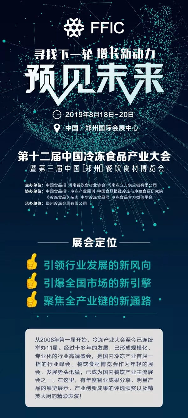 以“預(yù)見未來?尋找下一輪增長新動力”為主題的中國冷凍食品產(chǎn)業(yè)大會將于今年的8月18日-20日在鄭州國際會展中心重磅來襲,誠邀大家一起共商產(chǎn)業(yè)發(fā)展大事!