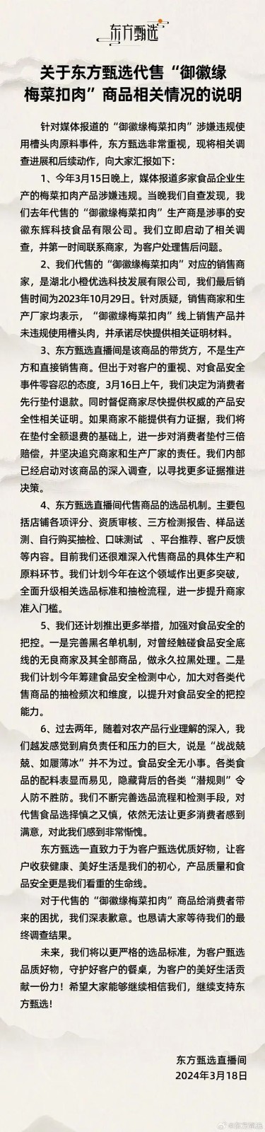3月18日,東方甄選、三只羊網絡通過官方微博發布情況說明稱,對于直播間代售的“御徽緣梅菜扣肉”商品給消費者帶來的困擾,深表歉意。