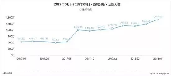 易觀數據顯示,進入四月,天氣回升,各類鮮果開始上市。生鮮電商瞄準時機,紛紛加強營銷活動的推廣,其移動端應用活躍人數也呈現發展態勢。2018年4月,生鮮電商應用活躍人數達到1715.8萬,活躍用戶環比增長13.7%。