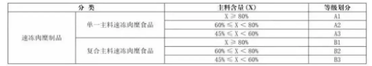 由此,單一主料速凍肉糜食品分為A1、A2、A3,復(fù)合主料速凍肉糜食品共分為B1、B2、B3。一級主料含量大于等于80%;二級主料含量在60%到80%之間;三級的主料含量在45%到60%之間。