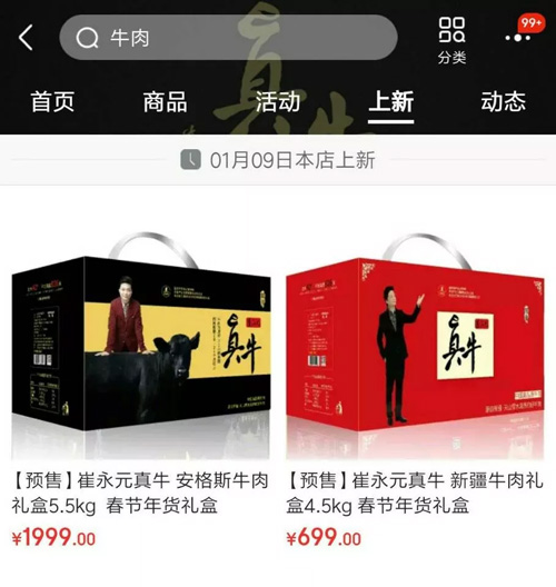 對此小編特意去崔永元的店里看了一下價格,牛肉主要分為兩款,一種是699元(4.5kg),一種是1999元(5.5kg),1999元購買5.5㎏牛肉,計算下來差不多每公斤就要363.45元,4.5kg規格的牛肉相對便宜一點兒。不過,這兩種規格的牛肉和市場價相比還是貴不少。