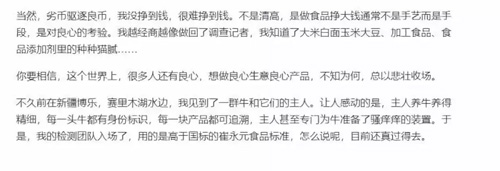 在長文中,崔永元對于這款牛肉進行了詳細介紹,他表示這款牛肉采用了國家標準和獨特的崔永元食品標準,并自豪的稱凡采用崔永元食品標準的食品至今“沒有出現一例主流科學界認定的安全問題”。