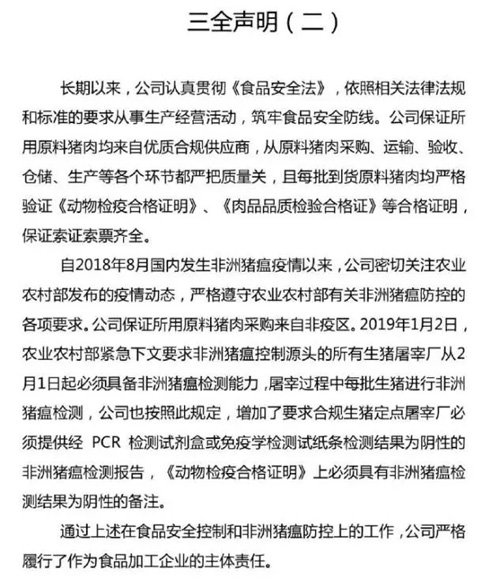 來(lái)源: 冷凍食品網(wǎng) 發(fā)布者:編輯昨天(20日)下午,三全食品通過(guò)新浪微博發(fā)布聲明稱(chēng),作為食品加工企業(yè),公司會(huì)主動(dòng)承擔(dān)更多的社會(huì)責(zé)任,主動(dòng)進(jìn)行合規(guī)原料豬肉進(jìn)廠二次非洲豬瘟檢測(cè),將對(duì)原料豬肉“批批檢”,最大程度地對(duì)消費(fèi)者負(fù)責(zé)。