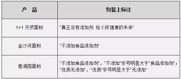 常見面粉品牌中,1+1、金沙河、香滿園等外包裝上,都印有與“沒有添加劑”相關的字樣。