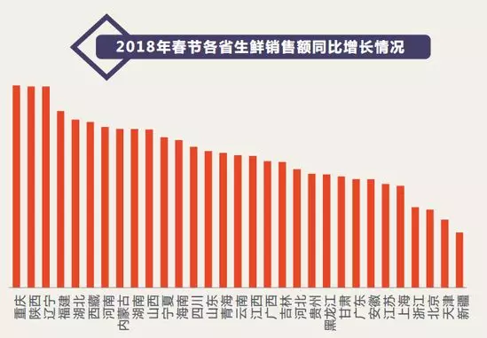 透過京東平臺,來自全球的進口海鮮和進口水果走上了國民的餐桌,彌補了地域的飲食不均衡,與2017年春節期間相比,2018年春節生鮮消費同比增長最快的省份包括重慶、陜西、遼寧、福建、湖北,其銷售額同比增長均超過300%。