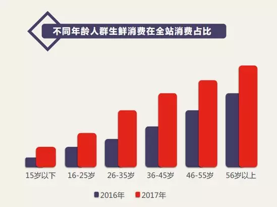 對比不同年齡段用戶在京東平臺的消費結構發現,50后、60后和70后用戶的生鮮消費在其京東全站消費占比最高,可見“銀發經濟”效應在生鮮電商領域更為明顯,網上買菜、買肉的習慣也在逐步取代菜市場在中老年人心里的地位。