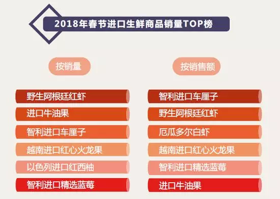 2018年春節期間,按照銷售額排序,最受歡迎的進口生鮮商品為:智利進口車厘子、野生阿根廷紅蝦、厄瓜多爾白蝦、越南進口紅心火龍果和智利進口精選藍莓。