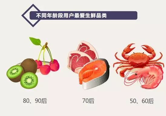 京東大數據發現,80后、90后愛買水果,奇異果/獼猴桃、車厘子是他們的最愛;70后偏愛買豬牛羊雞肉和蛋類;50后和60后愛買海鮮水產,其中以魚類和蝦類居多。