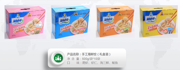 速凍食品包括:速凍海鮮餃子、海鮮餛飩系列產品。深加工海產品包括:貝類、蝦類、魚類、海帶、紫菜等,產品分三個系列:○1海參、鮑魚類高檔產品;○2貝類、蝦蟹、海帶等綜合加工產品;○3海產品罐頭、調味品等。產品均采用渤海灣特有的新鮮海鮮為原料,原肉入餡,美味可口,鮮味十足,營養豐富!